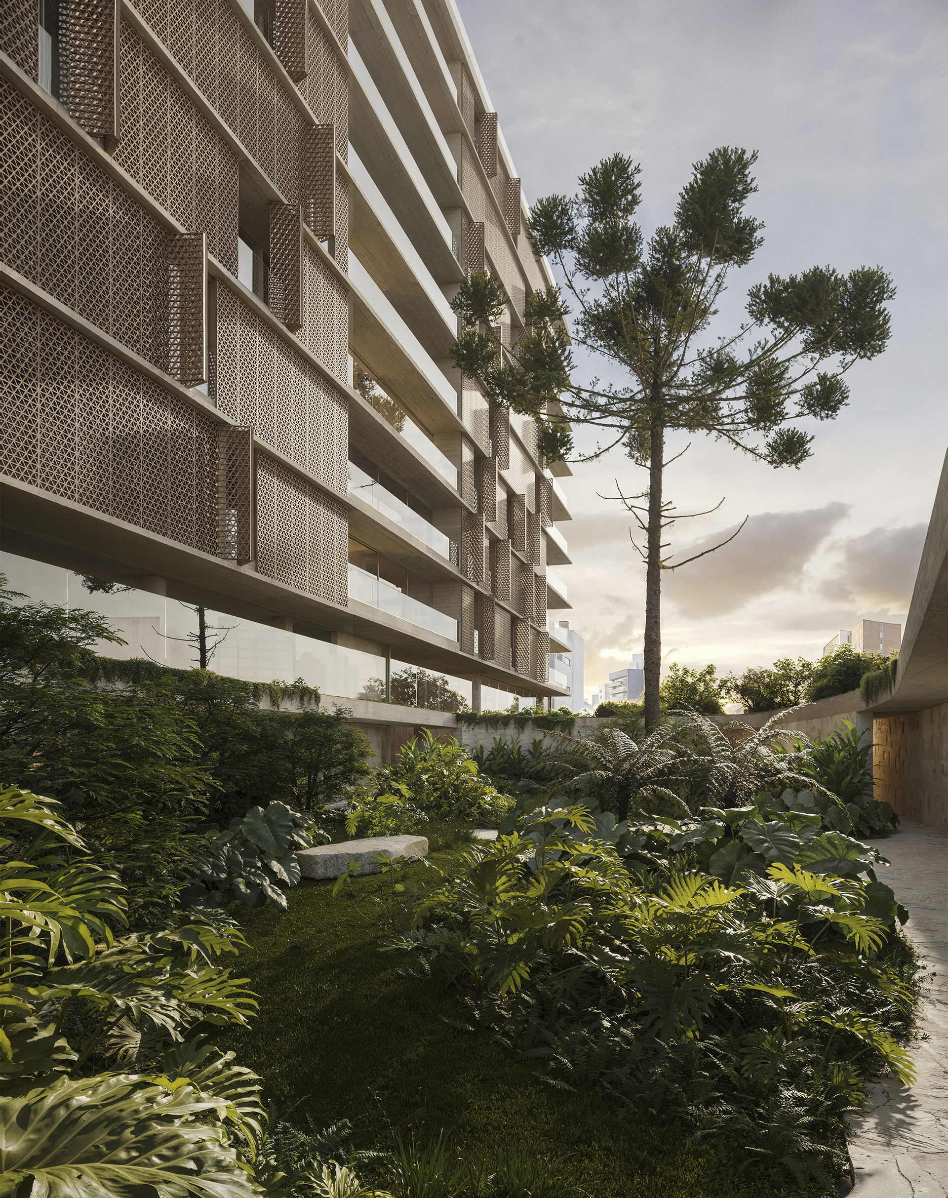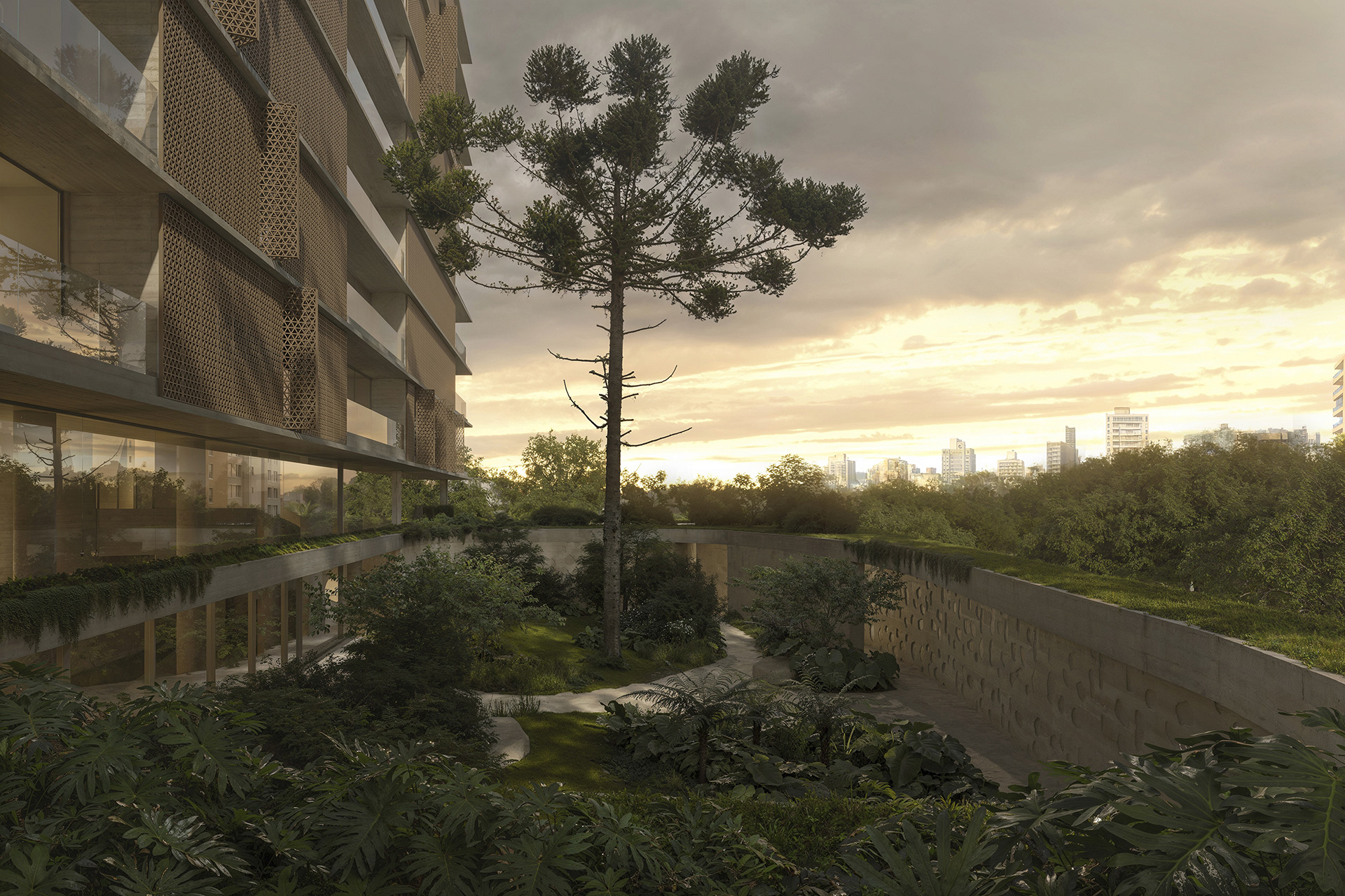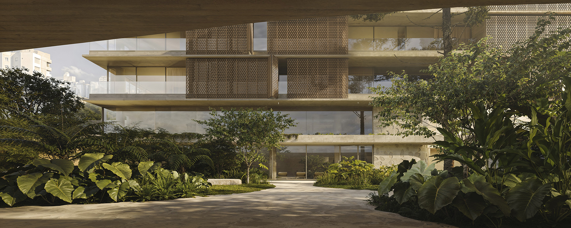 Integrado à arquitetura, o paisagismo compõe núcleos de bem-estar, mindfullness e lazer, onde o verde predomina e evoca o essencial.
